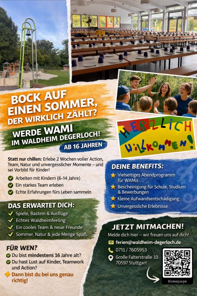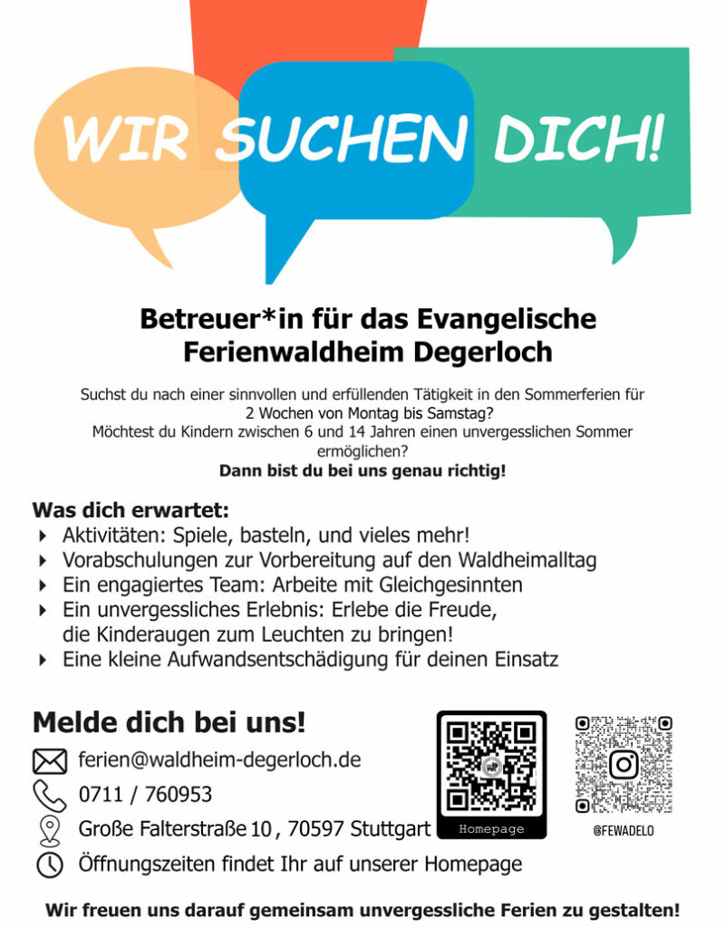 Zum 88. Mal lädt die Evangelische Kirchengemeinde Degerloch auch in diesem Jahr wieder alle Kinder aus Degerloch, Hoffeld, Sonnenberg, Asemwald, Steckfeld, Birkach, Hohenheim, Plieningen und Schönberg ganz herzlich in den Sommerferien ins Degerlocher Ferienwaldheim ein, um gemeinsam tolle Ferien zu erleben.